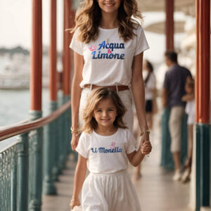Per la Figlia: Le t-shirt della nostra linea per le piccole principesse catturano la loro gioia e vivacità, ispirate ai colorati cocktail con aggettivi che ne definiscono iI temperamento.
